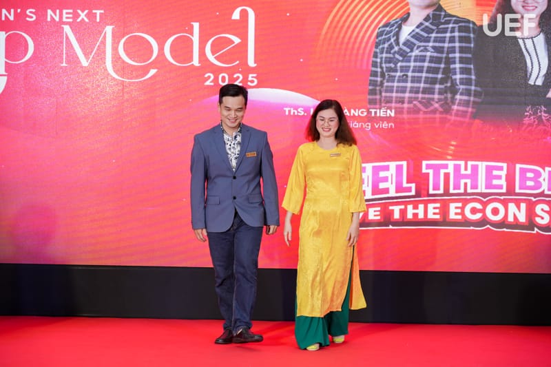 Ở phần “ra mắt” Ban Chủ nhiệm và tập thể giảng viên, nhân viên Khoa Kinh tế, các bạn tân sinh viên đã được gặp gỡ thầy cô theo phong cách trình diễn catwalk trẻ trung và sôi động.