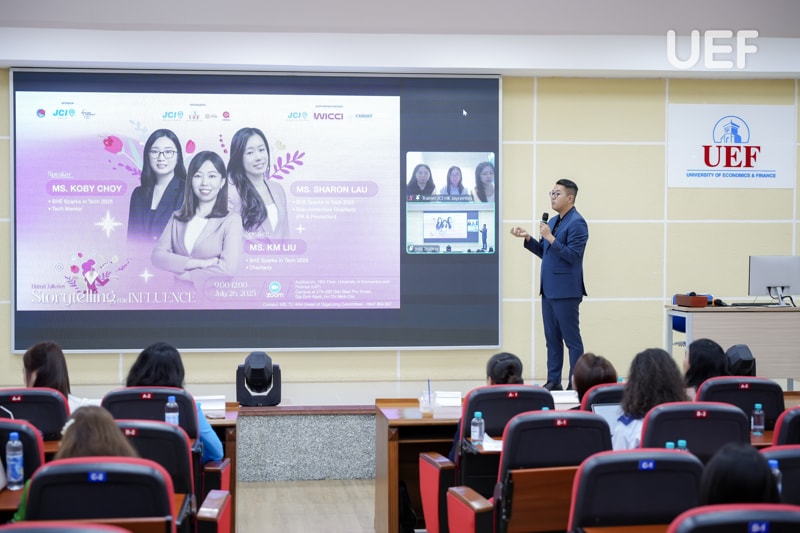 Sáng ngày 26/7, Khoa Kinh tế UEF đã phối hợp với JCI Wonder Woman Vietnam tổ chức chương trình Inspire Talk Series 2025 với chủ đề “Storytelling for Influence - Kể chuyện để tạo ảnh hưởng”. Chương trình là hoạt động nằm trong khuôn khổ dự án quốc tế She Sparks in Tech 2025, hướng tới việc phát triển kỹ năng ứng dụng nghệ thuật kể chuyện vào công việc và cuộc sống, đặc biệt là với phụ nữ trong thời đại công nghệ phát triển mạnh mẽ.