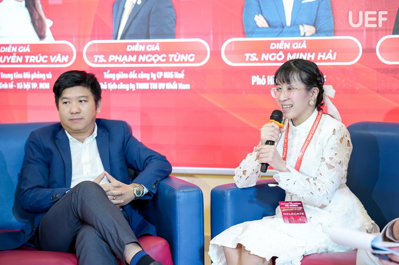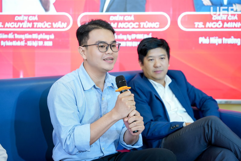 Phiên tọa đàm đã diễn ra sôi nổi với phần chia sẻ của ThS. Nguyễn Trúc Vân - Giám đốc Trung tâm Mô phỏng và Dự báo Kinh tế - Xã hội TP.HCM, TS. Phạm Ngọc Tùng - Tổng Giám đốc Công ty CP IMG Huế, Chủ tịch Công ty TNHH TM DV Nhất Nam, TS. Ngô Minh Hải - Phó Hiệu trưởng UEF, cựu sinh viên Đặng Chiêu Minh - Chuyên viên Kế hoạch kinh doanh - S.E.A | DP World và Moderator TS. Nguyễn Duy Quang - Trưởng ngành Kinh tế số.