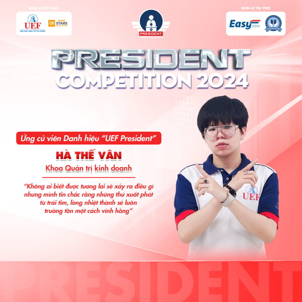 Top 6 President Competition 2024 không chỉ là những ứng viên xuất sắc với những thành tích cá nhân rực rỡ mà còn là những người đang thực sự nghiêm túc và quyết tâm với hành trình kiến tạo những giá trị tốt đẹp cho cộng đồng sinh viên UEF. Với tinh thần “vì mọi người” và bứt phá giới hạn ấy, hãy theo dõi và cổ vũ nhiệt tình cho 6 tài năng trẻ ở vòng Tranh cử nhé UEFers!