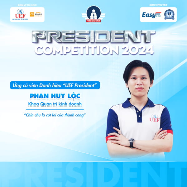 Đặc biệt, với kinh nghiệm từng là Team Leader tại Câu lạc bộ BIHub và hiện là Phó chủ nhiệm của Câu lạc bộ BMC, Phan Huy Lộc đã tích lũy được nhiều kiến thức và kỹ năng quản lý, tổ chức và lãnh đạo. Lý do ứng cử của Phan Huy Lộc cho vị trí President của UEF là sự cam kết xây dựng hình ảnh chuyên nghiệp và uy tín cho sinh viên UEF trong mắt các doanh nghiệp. Thông qua các hoạt động, Huy Lộc muốn rèn luyện cho sinh viên không chỉ về chuyên môn mà còn về tinh thần chuyên nghiệp và sự cần cù. Điều này sẽ tạo nên một "điểm khác biệt" cho sinh viên UEF, giúp bạn tự tin và thành công trong sự nghiệp sau này.