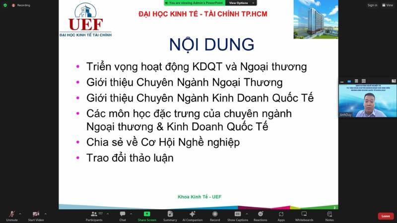 Phát biểu khai mạc tại hai buổi Talkshow, ThS. Nguyễn Lê Đông Xuân – Phó Trưởng Khoa Kinh tế kiêm Trưởng ngành Kinh doanh quốc tế cho biết: “Tại hai buổi Talkshow, Khoa Kinh tế đã mời đến không chỉ các Thầy/Cô giảng dạy trong ngành Kinh doanh quốc tế mà còn những diễn giả có nhiều kinh nghiệm trong lĩnh vực xuất nhập khẩu, logistics, kinh doanh quốc tế đến từ các doanh nghiệp, tập đoàn đa quốc gia, mục đích giúp các bạn sinh viên có cái nhìn đa dạng về lĩnh vực/ngành nghề, giúp các bạn vững tin vào quyết định lựa chọn chuyên ngành của mình”.