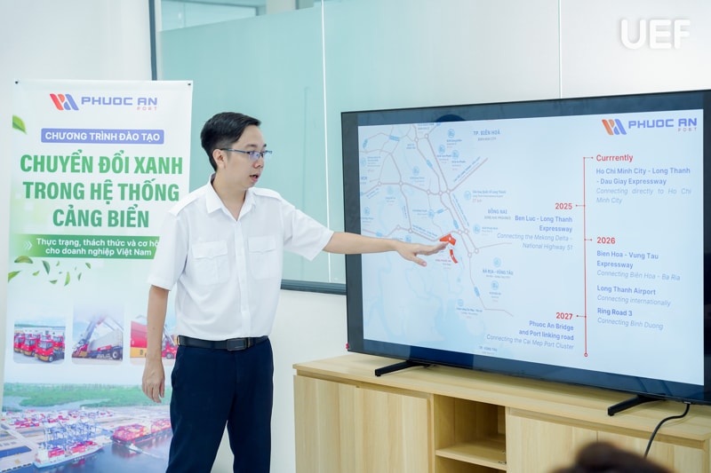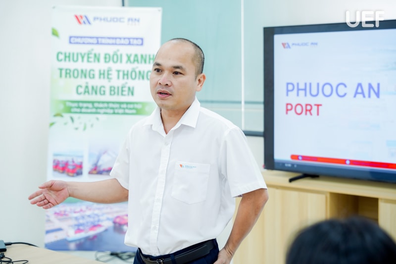 Trong buổi chia sẻ, ông Đặng Đình Đức đã giới thiệu chi tiết về quá trình vận hành và cách thức hoạt động của cảng Phước An. Ông phân tích vị trí địa lý chiến lược, tuyến dịch vụ trực tuyến hiện đại và những thông số hoạt động ấn tượng. Cảng Phước An tự hào vận hành với 100% thiết bị sử dụng năng lượng sạch từ thủy điện. Đặc biệt, cảng đạt hiệu suất cao với tốc độ xử lý 25 đơn vị vận chuyển mỗi giờ. Công nghệ xanh và hiệu suất là điểm nổi bật, tiên phong trong xu hướng phát triển Logistics bền vững.