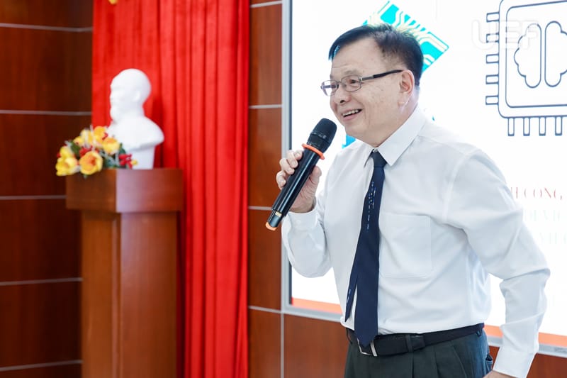 Với những kiến thức chuyên sâu, diễn giả đã giải thích khái niệm của kinh tế số và kinh tế xanh, làm rõ tầm quan trọng của con chip bán dẫn - “bộ não” của tất cả các thiết bị điện tử hiện đại. Thông qua một “chuyến du hành” đặc biệt vào bên trong một con chip, ông giúp các bạn sinh viên hiểu rõ hơn về cấu trúc phức tạp và ứng dụng rộng rãi của chip trong đời sống 4.0. Được biết, mỗi người tiêu dùng bình quân sử dụng đến 120 con chip mỗi năm, từ điện thoại di động đến các thiết bị gia dụng, phương tiện di chuyển và nhiều sản phẩm công nghệ khác.