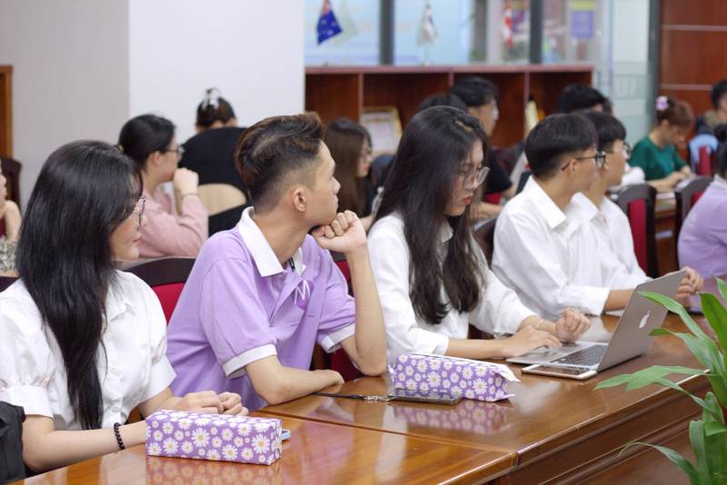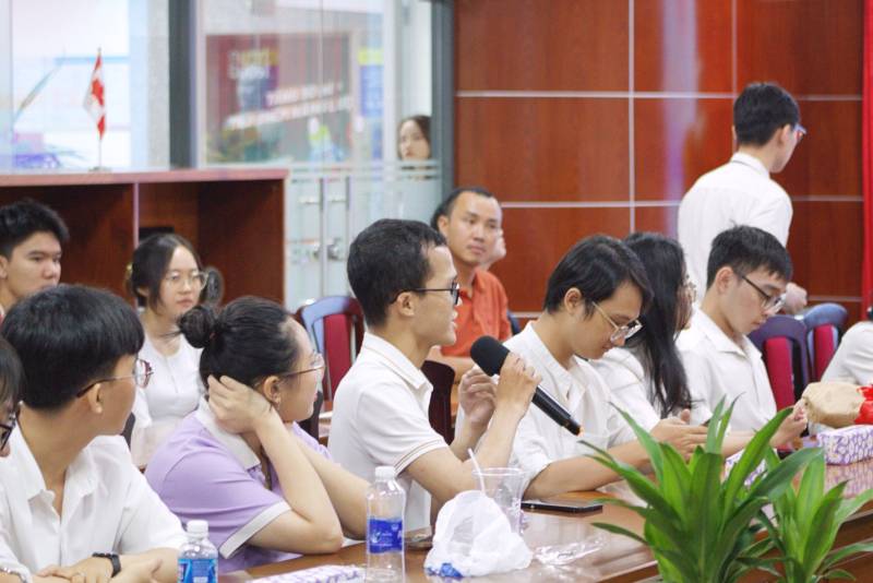 Các bạn sinh viên lắng nghe những phần chia sẻ của các diễn giả cũng như đặt câu hỏi, đưa ra quan điểm của bản thân về lĩnh vực nghiên cứu khoa học.
