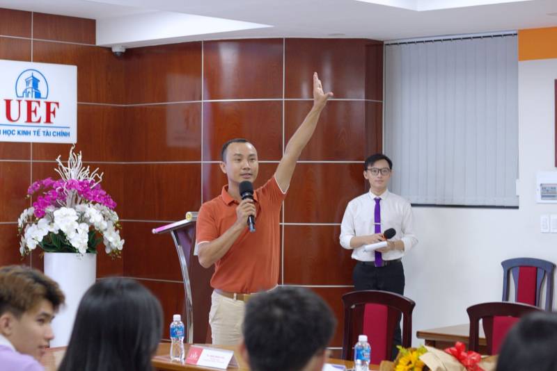 "Kỹ năng nghiên cứu khoa học dành cho Sinh viên ngành Marketing: Từ ý tưởng đến xây dựng đề tài nghiên cứu", sự kiện có sự tham gia của TS. Ngô Minh Hải, Phó Hiệu trưởng UEF (thứ 1 từ phải sang), ngoài ra còn có các Diễn giả TS. Phan Bảo Giang, Trưởng Khoa Marketing (thứ 2 từ phải sang), diễn giả sinh viên bạn Huỳnh Thái Nguyên, sinh viên song ngành Marketing và Quản trị nhân sự. Ngoài ra còn có sự tham gia của