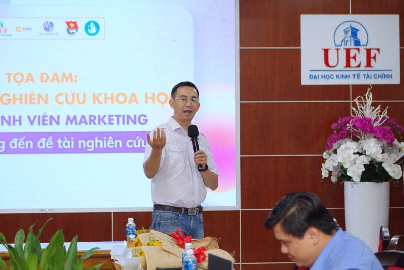 Phó Trưởng Khoa Marketing (cầm micro), đã chia sẻ những kinh nghiệm và kiến thức về lĩnh vực nghiên cứu khoa học, đặc biệt là tầm quan trọng của nghiên cứu khoa học đối với các bạn sinh viên, từ các quy trình trong nghiên cứu khoa học, những sáng kiến của các bạn sinh viên có thể triển khai thành những đề tài nghiên cứu mang tính ứng dụng cao trong thời đại Marketing 6.0, cho đến việc xác định những "khe hở" để có thể thực hiện được đề tài nghiên cứu khoa học chất lượng.