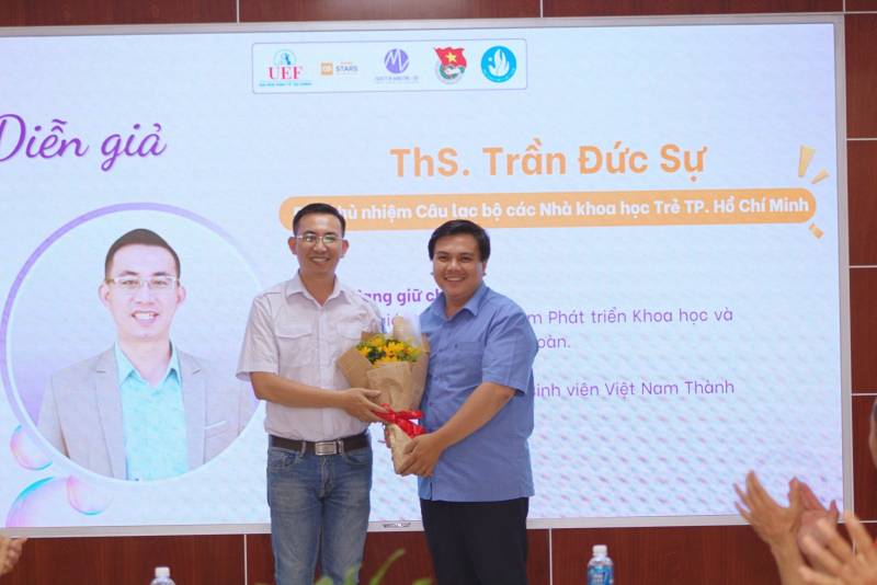 Trao hoa cho các diễn giả trong buổi ra mắt CLB Bookmark NCKH cùng tọa đàm với chủ đề