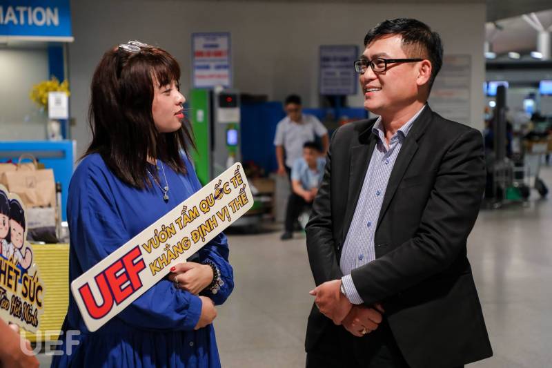 Và không thể không nhắc đến sự hiện diện đặc biệt của thầy Đỗ Quốc Anh, Phó Chủ tịch Hội đồng trường cũng ra sân bay để tiễn bạn lên đường, đồng thời thầy cũng gửi lời động viên, khích lệ tinh thần cho An Bình. Nâng cao tinh thần UEFER trên trường quốc tế.