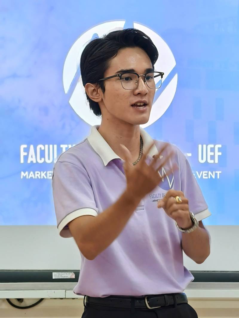 Tiến sĩ Phan Bảo Giang, Trưởng Khoa Marketing UEF, mở đầu phần trình bày với chủ đề "Các hoạt động làm nghề Marketing truyền thông". Với phong cách giảng dạy cuốn hút và hàng loạt ví dụ thực tế từ các chiến dịch nổi tiếng, thầy đã biến những khái niệm phức tạp của marketing trở nên dễ hiểu và gần gũi.