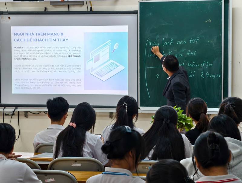 Tiếp nối chương trình, Thạc sĩ Nguyễn Tuấn Khoa, giảng viên Khoa Marketing UEF, mang đến phần trình bày về "Các hoạt động Digital Marketing". Với kinh nghiệm thực tiễn tại doanh nghiệp, thầy đã giới thiệu những công cụ và xu hướng mới nhất như quảng cáo trên mạng xã hội, SEO, influencer marketing, Livestream,..... Sự phấn khích được thể hiện trên khuôn mặt các các em, khi các em học sinh được lắng nghe các câu chuyện thực tế cùng các các ví dụ minh họa sống động mà thầy Khoa đã giải thích về TikTok, Livestream, sáng tạo nội dung quảng cáo và cách các thương hiệu tận dụng hiệu quả nền tảng Digital.