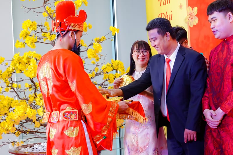 Chương trình được mở đầu bằng các tiết mục văn nghệ và múa lân đầy sôi động, khí thế với niềm tin về một năm mới thành công và thịnh vượng.