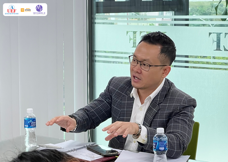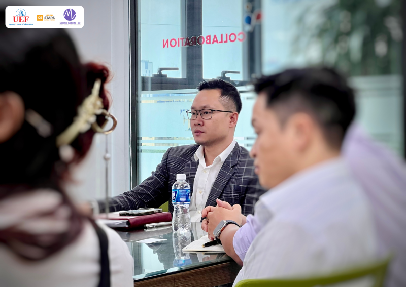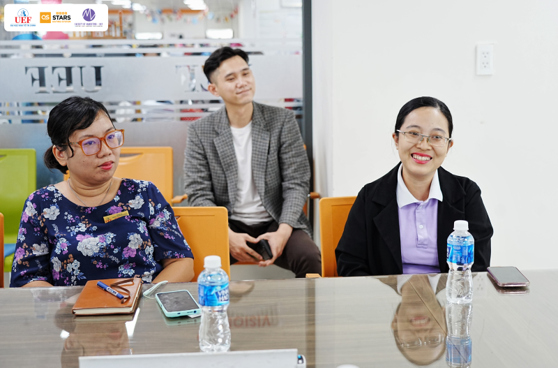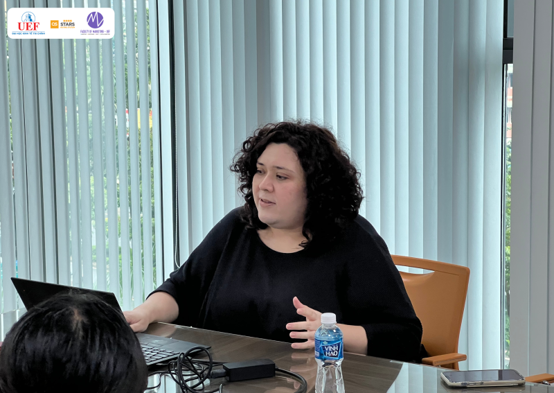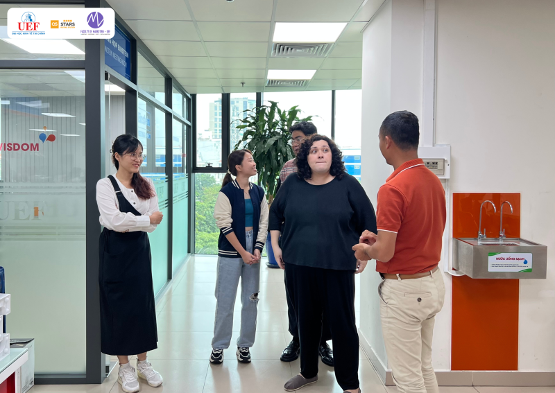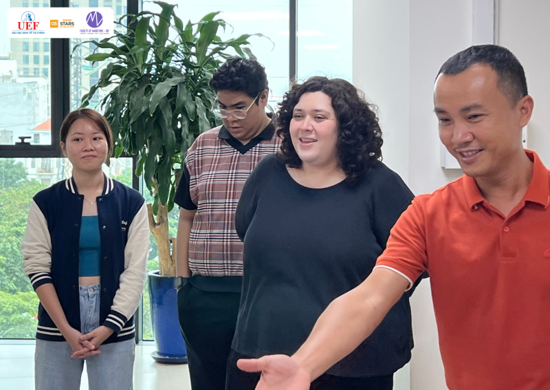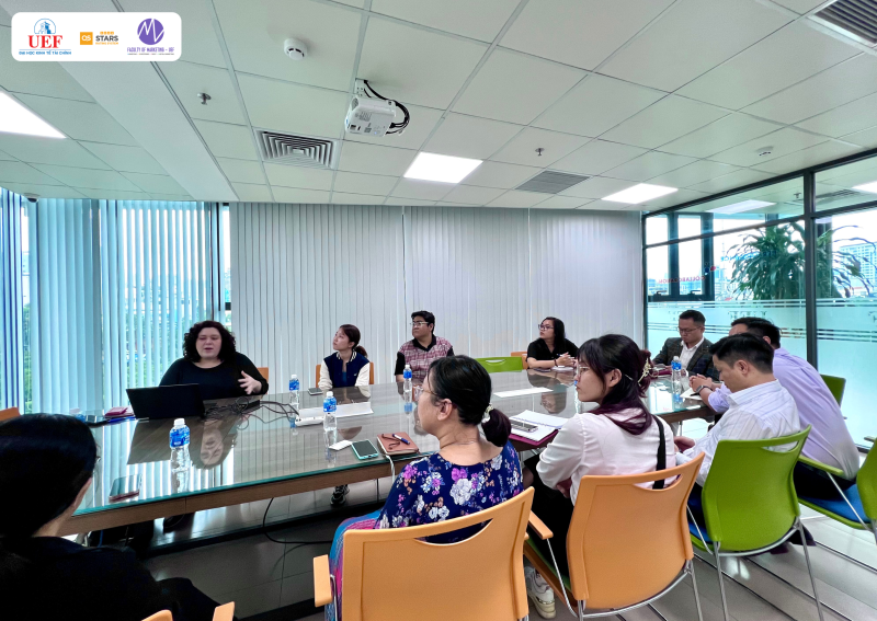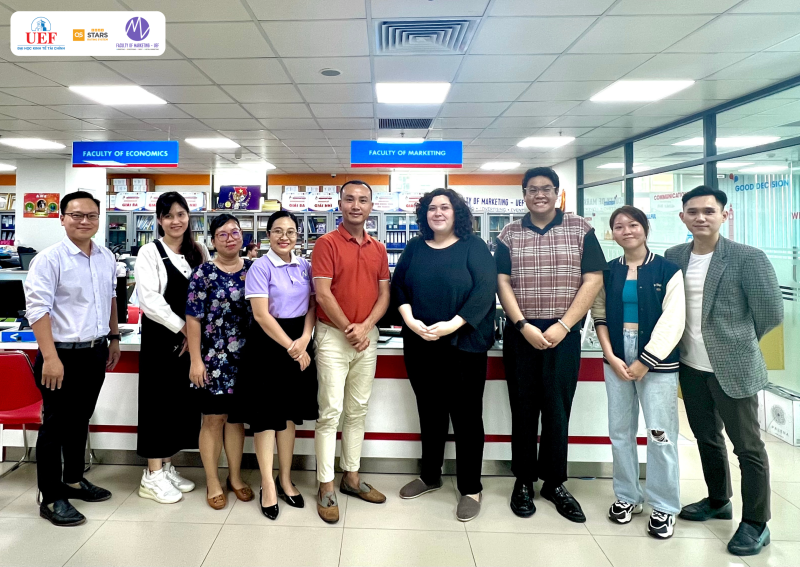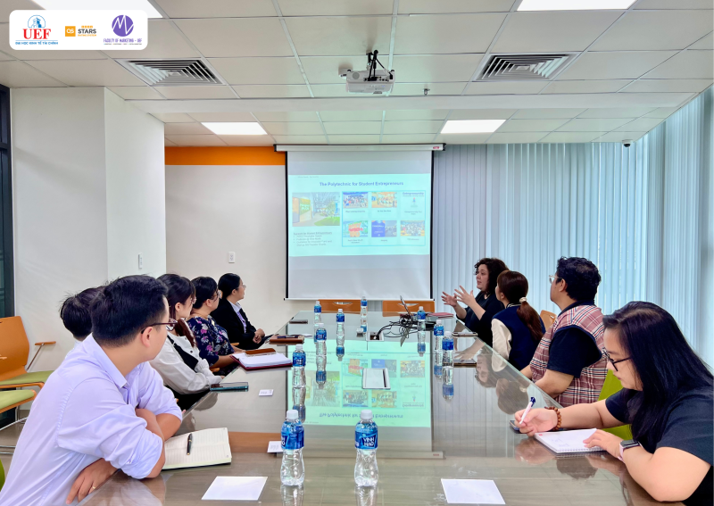 Tiến sĩ Phan Bảo Giang, Trưởng Khoa Marketing UEF (áo cam), đã trao đổi một số vấn đề liên quan công tác tổ chức cuộc thi và giới thiệu về Khoa Marketing nhà UEF. ThS. Ngô Thanh Phương Quỳnh (áo tím) và ThS. Huỳnh Tú Anh - Phó trưởng khoa Marketing (thứ 2 từ trái sang) đại diện trong công tác phối hợp triển khai, kết nối các hoạt động quốc tế đối với Khoa Marketing, cũng như hướng dẫn phía Ngee Ann Polytechnic (Singapore) tham quan cơ sở vật chất nhà UEF
