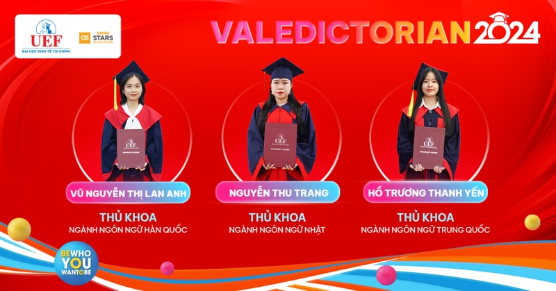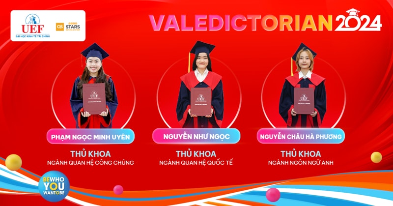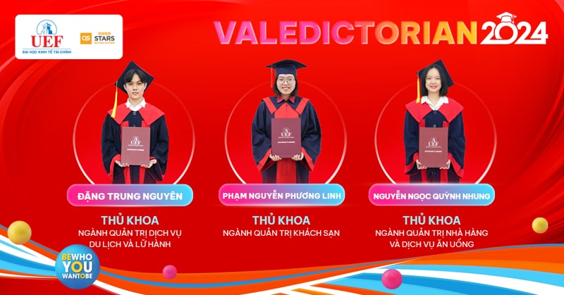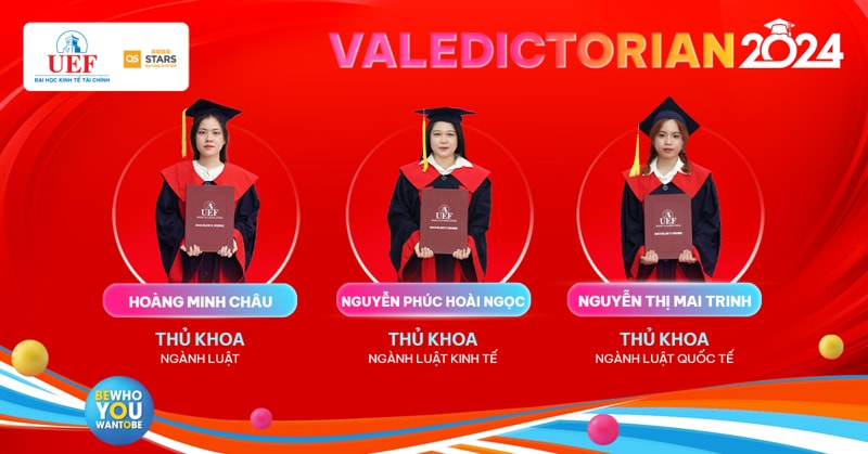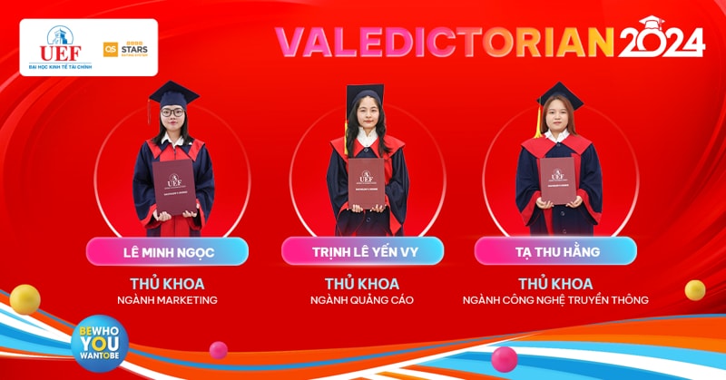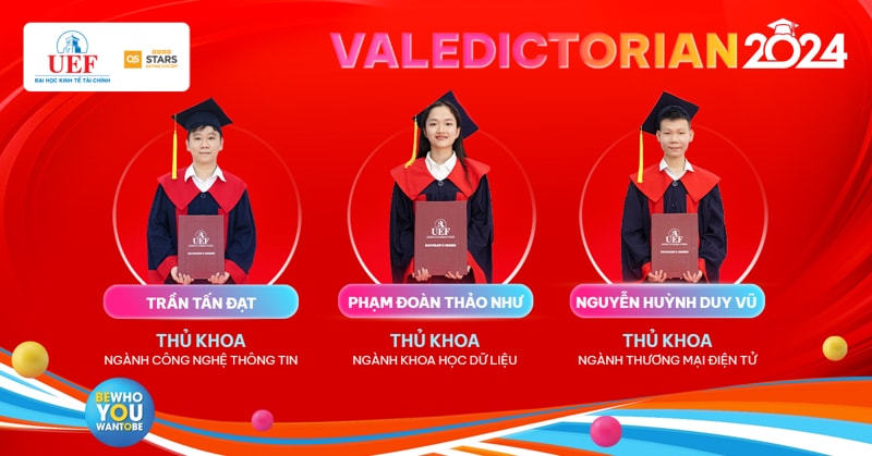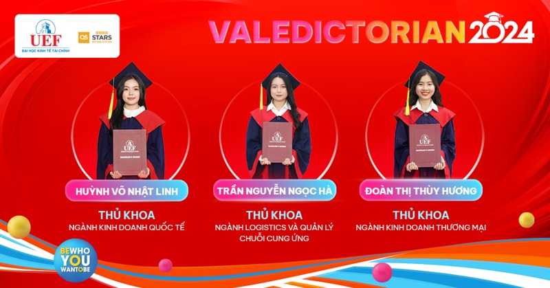 Sau 4 năm miệt mài đèn sách, Thủ khoa ngành chính là dấu son rực rỡ nhất trên hành trình thanh xuân của 25 UEFers dưới mái nhà UEF. Mang theo niềm tự hào này rời khỏi ghế Nhà trường, hy vọng các bạn sẽ tiếp tục vững bước và phát triển rực rỡ dù ở bất kỳ đâu. Các gương mặt Thủ khoa của Nhà UEF sẽ được vinh danh, trao thưởng trong Lễ tốt nghiệp diễn ra vào các ngày 21/8, 22/8 và 23/8 tại Nhà hát Hòa Bình (240 Đường 3/2, Phường 12, Quận 10, Thành phố Hồ Chí Minh).