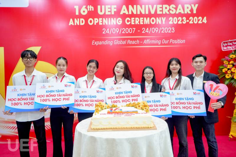 Đáng chú ý, trong Lễ khai giảng, Nhà trường đã trao 38 suất học bổng tuyển sinh 100% cho tân sinh viên Khóa 2023 theo từng phương thức và 44 suất học bổng tài năng cho sinh viên các ngành thuộc các khóa với tổng giá trị học bổng gần 4 tỷ đồng. Đồng thời, UEF cũng vinh danh các Thủ khoa đầu vào theo các phương thức xét tuyển.