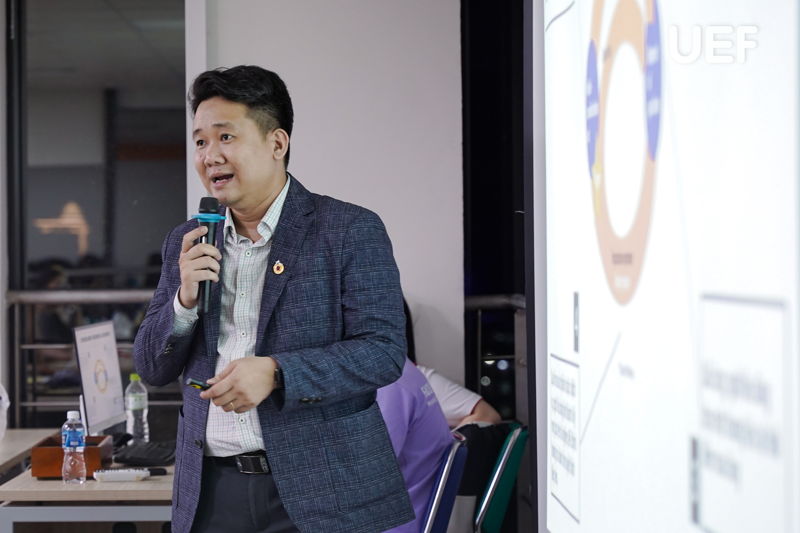 Tham gia chia sẻ cùng sinh viên UEF tại talkshow là CEO của Công ty TNHH Đầu tư Sáng tạo điểm (Creative Point) - ông Nguyễn Kim Huy. Với hơn 15 năm kinh nghiệm hoạt động trong lĩnh vực tư vấn truyền thông marketing, diễn giả đã có những câu chuyện hết sức giá trị, mang tính thực tế cao gửi đến sinh viên.