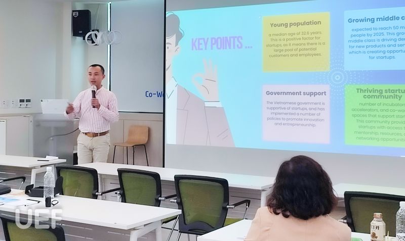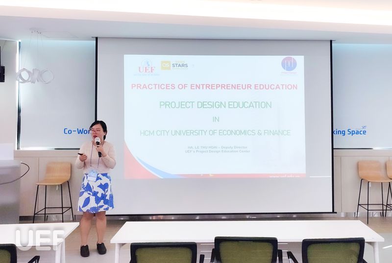Hội nghị Sinh viên khởi nghiệp quốc tế tại Busan cũng là nơi cho các giảng viên - đại diện các trường tham gia chia sẻ kinh nghiệm và mô hình khởi nghiệp tại đơn vị của mình. ThS. Hà Lê Thu Hoài đã có phần giới thiệu về các môn Thiết kế Dự án (PD – Project Design) của UEF. Cô nhấn mạnh, đây là nền tảng để sinh viên phát triển ý tưởng và kỹ năng khởi nghiệp. Tiếp đó, TS. Phan Bảo Giang cũng đã trình bày về hoạt động start-up cho sinh viên UEF. Hoạt động này là một cơ hội rất tốt để UEF tiếp tục đẩy mạnh hành trình quốc tế hóa và hợp tác với các trường đối tác.
