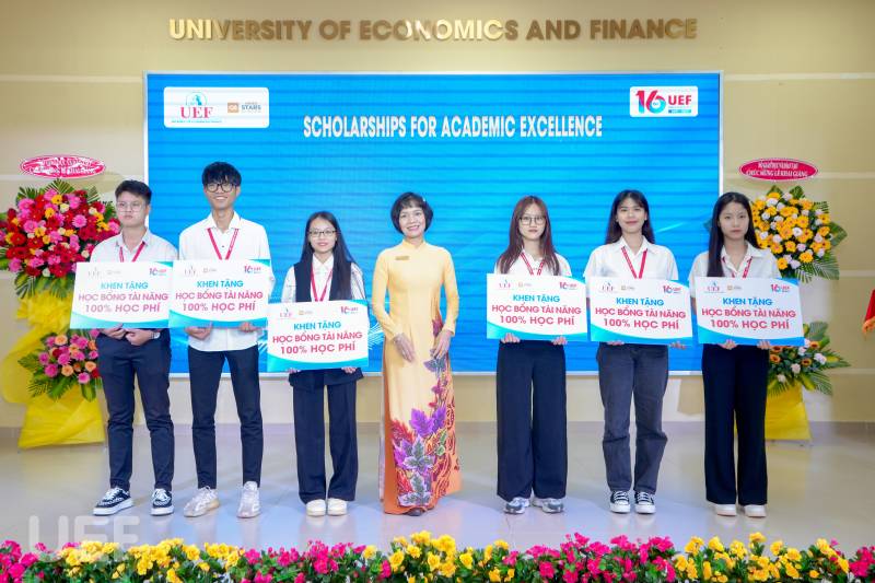 Nguyễn Thanh Hiền Linh (thứ 3 từ trái sang) và Lê Ngọc Hân (thứ 2 từ phải sang) trong Lễ khai giảng năm học tại hạng mục vinh danh khen tặng học bổng 100% tại UEF