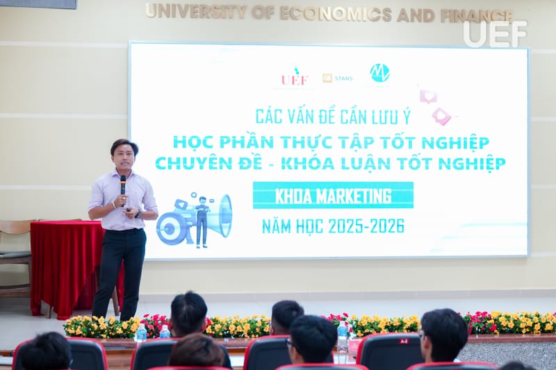 Bên cạnh phần chia sẻ từ khách mời, Khoa Marketing và Trung tâm Hợp tác doanh nghiệp cũng phổ biến những thông tin quan trọng liên quan đến kế hoạch thực tập như các mốc thời gian cần lưu ý, quy trình viết báo cáo, định hướng chuyên đề - khóa luận, cùng với việc chuẩn bị cho ngày hội việc làm Mock Interview & JobFair 2025. Những thông tin này giúp sinh viên chủ động sắp xếp lộ trình, chuẩn bị kỹ lưỡng hơn cho kỳ thực tập quan trọng sắp tới.