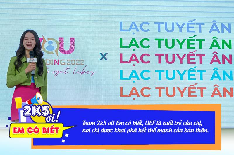 2K5 ơi! Các bạn ơi! Đời sinh viên ngắn ngủi lắm đó, ở UEF các bạn và các em sẽ không lo thiếu “đất diễn”, hãy nắm bắt mọi cơ hội nha! Lộ trình 4 năm học của chúng ta đều gần như giống nhau, nhưng Tuyết Ân nghĩ rằng sự khác biệt lớn nhất nằm ở trải nghiệm của tuổi trẻ. Tuyết Ân mong rằng team 2K5 - thế hệ tiếp theo của Nhà UEF và tất cả các bạn sinh viên tại nhà UEF sẽ có một tuổi trẻ rực rỡ và đáng nhớ.
