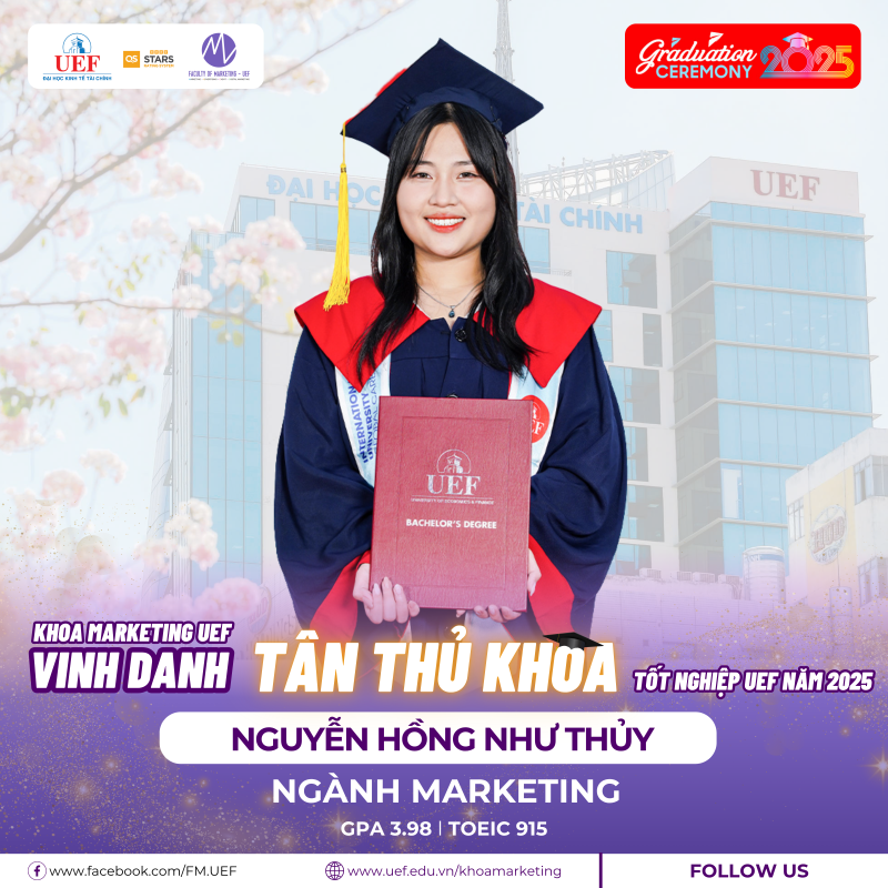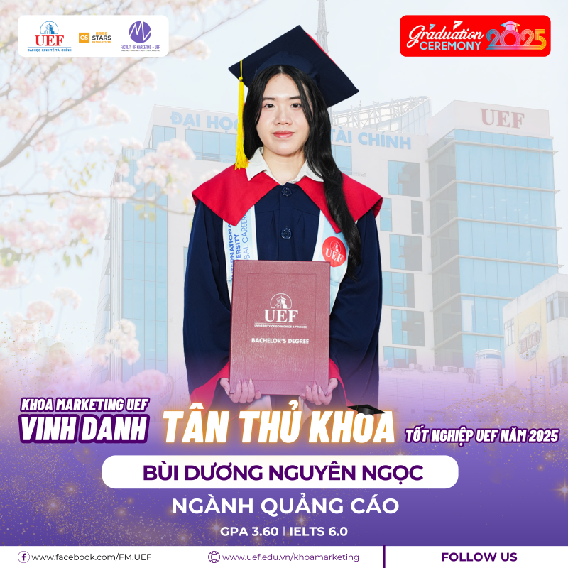 Khoa Marketing UEF xin chúc mừng và vinh danh hai tân Cử nhân chính thức trở thành Thủ khoa ngành Marketing và Thủ khoa ngành Quảng cáo trong Lễ tốt nghiệp năm 2025. Với GPA ấn tượng, thành tích nổi bật trong học thuật, nghiên cứu khoa học và các hoạt động ngoại khóa, các bạn là niềm tự hào của Khoa và là tấm gương sáng cho các thế hệ sinh viên tiếp nối.
