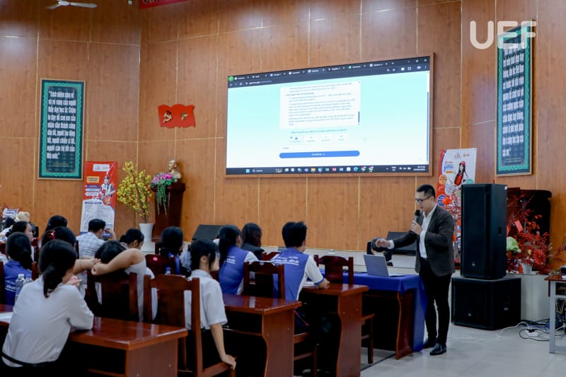 Trong nỗ lực góp phần nâng cao năng lực công dân số cho học sinh THPT, UEF đã phối hợp với trường THPT Nguyễn Trung Trực, huyện Bến Lức, tỉnh Long An (nay là tỉnh Tây Ninh) tổ chức buổi tập huấn có chuyên đề “Sử dụng AI trong học tập” vào ngày 22/5. Buổi tập huấn được triển khai nhằm nâng cao nhận thức và năng lực sử dụng công nghệ trí tuệ nhân tạo (AI) trong học đường.