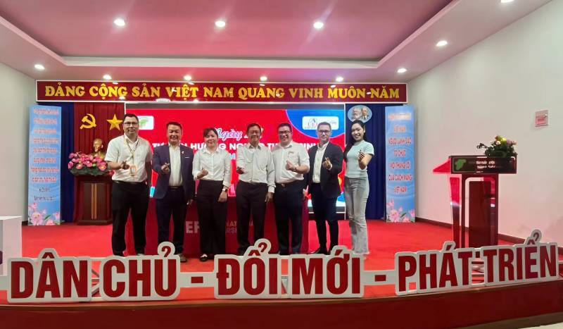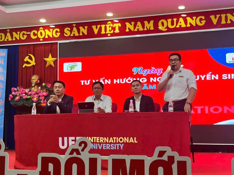 Ngày Hội Tư vấn Hướng nghiệp Tuyển sinh năm 2025 do UEF phối hợp tổ chức cùng Trung tâm có sự tham gia của (từ trái sang) ông Hồ Võ Trọng Vinh, Thạc sĩ Nguyễn Ngọc Thạch, bà Nguyễn Thị Thân, Tiến sĩ Nguyễn Đức Nghĩa, Thạc sĩ Bùi Quang Đông, Thạc sĩ Lê Hiếu Nghĩa và sinh viên vận động viên Châu Kim Loan, cùng các em học sinh vận động viên trẻ tại Trung tâm Huấn luyện và Thi đấu Thể dục Thể thao Thành phố Hồ Chí Minh.