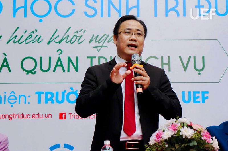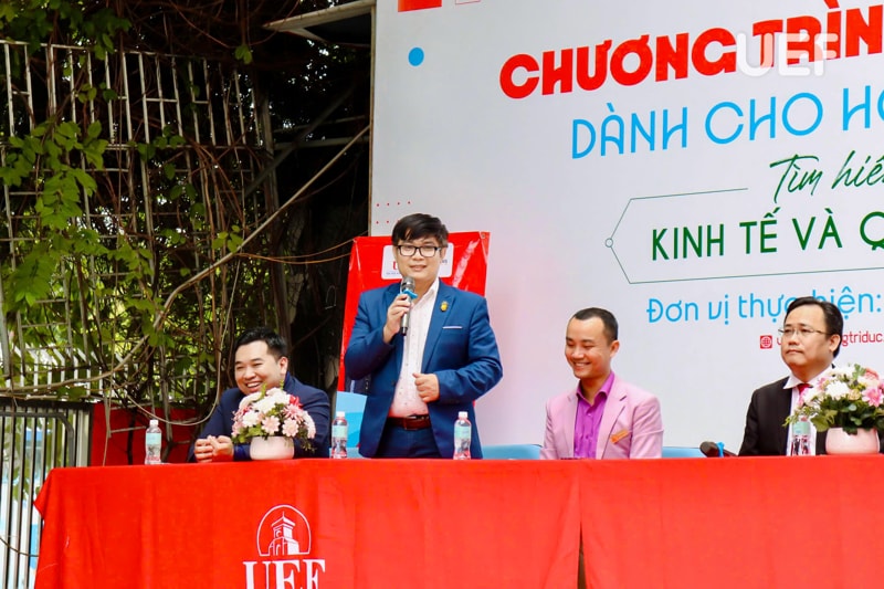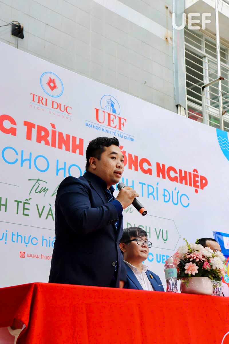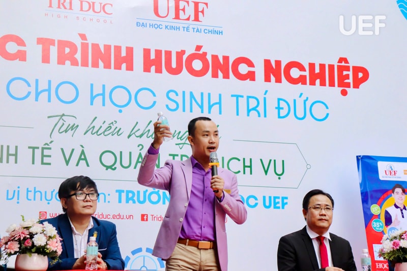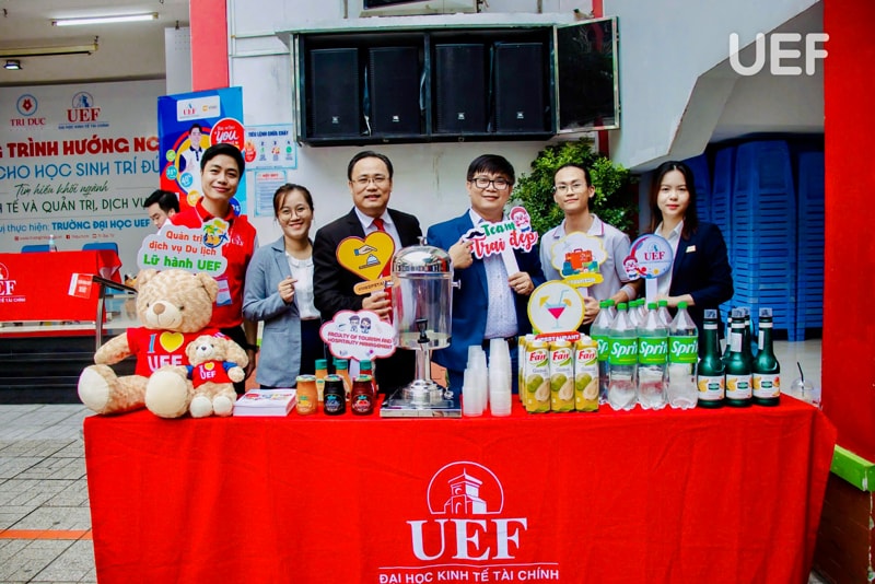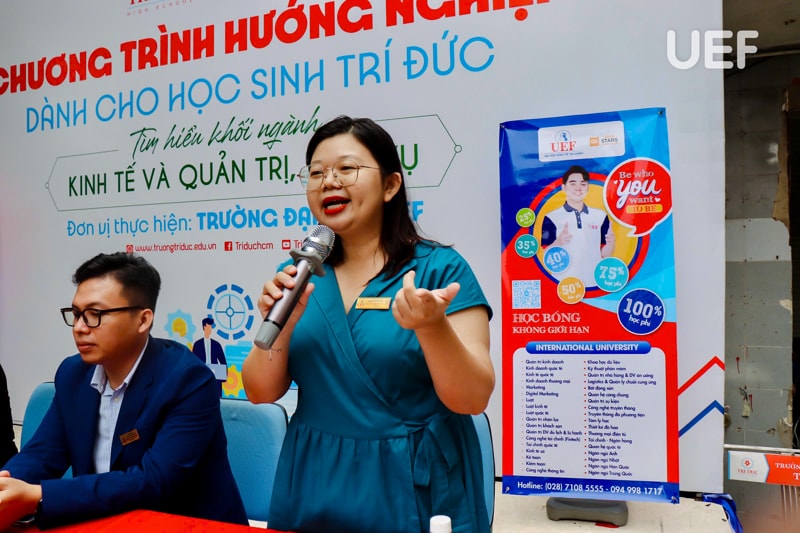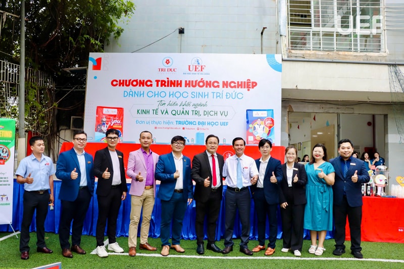 Ban tư vấn UEF tham gia cung cấp thông tin và hướng nghiệp cho học sinh Trí Đức có ThS. Phạm Doãn Nguyên - Giám đốc Trung tâm Phát triển kỹ năng và Hướng nghiệp UEF, TS. Phan Bảo Giang - Trưởng Khoa Marketing, ThS. Nguyễn Viết Thủy - Phó Trưởng Khoa Quản trị du lịch - Khách sạn, ThS. Nguyễn Thanh Lâm - Phó Trưởng Khoa Tài chính - Kế toán, ThS. Nguyễn Ngọc Thủy Tiên - Phó Trưởng Khoa Quản trị kinh doanh và TS. Phạm Quốc Hải - Trưởng ngành Kinh tế quốc tế, Khoa Kinh tế.