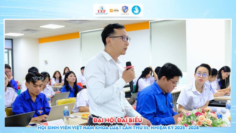 Sáng ngày 01/11/2025, Đại hội Đại biểu Hội Sinh viên Việt Nam Khoa Luật lần thứ III, nhiệm kỳ 2025 – 2028 đã diễn ra trang trọng tại Trường Đại học Kinh tế – Tài chính TP.HCM (UEF), đánh dấu một chặng đường mới đầy năng động và nhiệt huyết của phong trào sinh viên Khoa Luật.