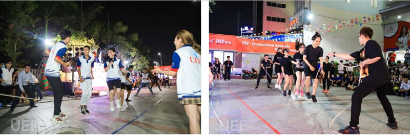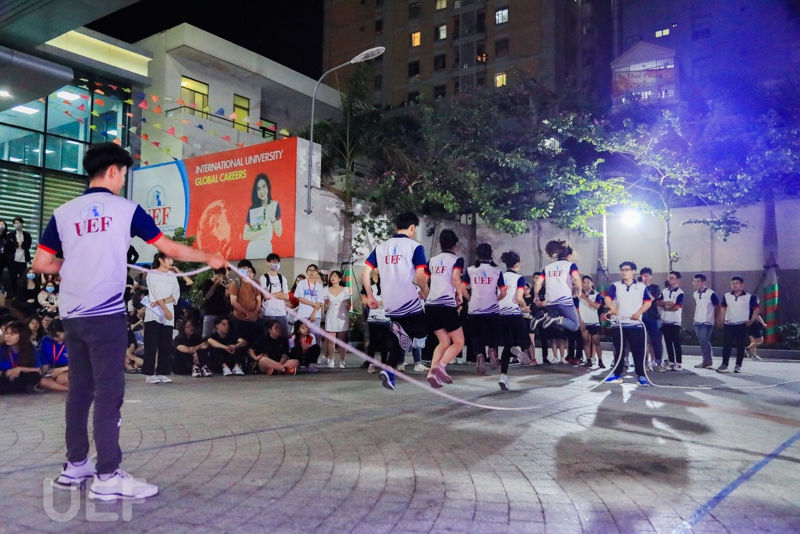 Giây phút mong chờ nhất đêm thi đấu đã đến, những đội hình mạnh nhất của 2 bộ môn Nhảy dây và Kéo co đã sẵn sàng vào cuộc. Không chỉ có sinh viên mà thầy, cô cũng nhiệt tình cổ vũ càng đẩy cao tinh thần vì “màu cờ sắc áo”.