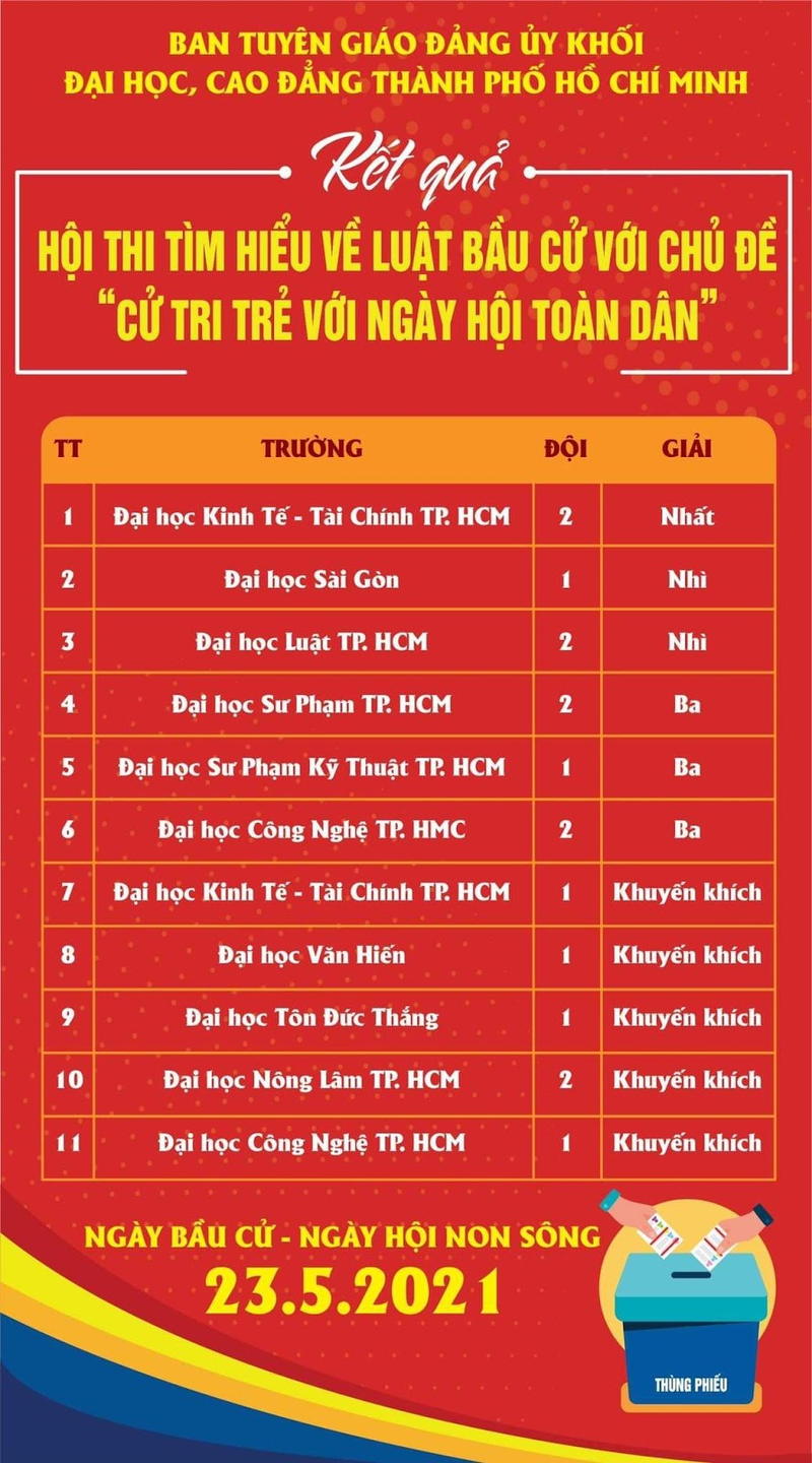 Nhằm chào mừng ngày hội bầu cử diễn ra vào ngày 23/5 sắp tới, Ban Tuyên giáo Đảng ủy Khối Đại học, Cao đẳng TP.HCM phối hợp với Đảng ủy Trường Đại học Tôn Đức Thắng đã tổ chức vòng Chung kết Hội thi tìm hiểu về Luật bầu cử với chủ đề “Cử tri trẻ với ngày hội toàn dân” vào sáng ngày 20/5. Cuộc thi là sân chơi bổ ích dành cho Đoàn viên, Đảng viên là sinh viên của các trường trong Khối.