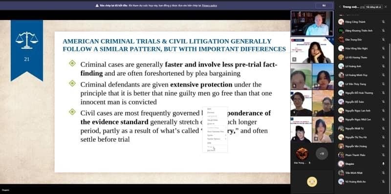 Các buổi học đều thu hút đông đảo sinh viên tham gia, những kiến thức thực tiễn từ luật sư quốc tế cũng giúp các bạn có góc nhìn sâu sát  hơn về hệ thống pháp luật ở Mỹ nói riêng và thế giới nói chung.