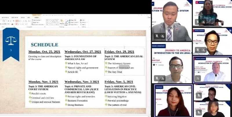 Theo nội dung khái quát mà giáo sư giới thiệu, khóa học sẽ có 5 buổi tương ứng với 5 chủ đề diễn ra từ ngày 27/10 đến ngày 5/11/2021. Theo đó, chủ đề đầu tiên là "Nền tảng của luật pháp Mỹ" (ngày 27/10), chủ đề 2 là "Hệ thống pháp luật của Mỹ" (ngày 29/10), chủ đề 3 là "Hệ thống tòa án ở Mỹ" (1/11), chủ đề 4 là "Luật cá nhân và luật thương mại" (ngày 3/11) và chủ đề 5 là "Tìm hiểu về tố tụng dân sự trong thực tế ở Mỹ" (ngày 5/11). Mỗi buổi học sẽ diễn ra từ 18g30 đến 20g00 trên nền tảng Microsoft Teams.