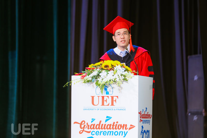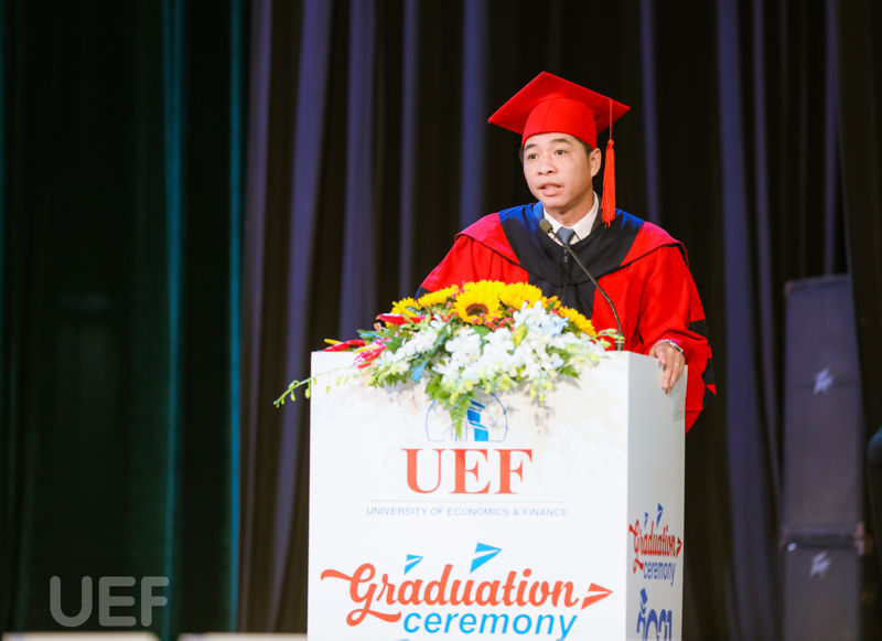 Trong không khí trang trọng và đầy ắp cảm xúc, TS. Nguyễn Thanh Giang – Hiệu trưởng UEF đã thay mặt Nhà trường gửi lời chúc mừng đến các tân Thạc sĩ, Cử nhân: “Hôm nay, chúng ta trân trọng chúc mừng 80 tân thạc sĩ và 664 tân cử nhân. Thay mặt các bạn học viên, sinh viên, tôi xin cảm ơn quý thầy cô đã đóng góp cho công việc đào tạo của Nhà trường. Với các tân Thạc sĩ, tôi tin rằng sau thời điểm hôm nay, các anh chị sẽ làm việc tốt hơn và cống hiến hết mình cho cơ quan, tổ chức. Với các bạn tân Cử nhân, tốt nghiệp và nhận bằng đại học chưa phải là đích đến cuối cùng, đó là sự bắt đầu cho hành trình mới. Trong hành trình đó sẽ có khó khăn, thuận lợi, nhưng tôi tin rằng các bạn sẽ không bao giờ dừng bước và luôn thành đạt. Trong sự thành đạt sau này của các bạn, ít nhiều đều có dấu ấn của UEF. Tôi mong rằng các bạn sẽ luôn là phiên bản tốt hơn của chính mình".