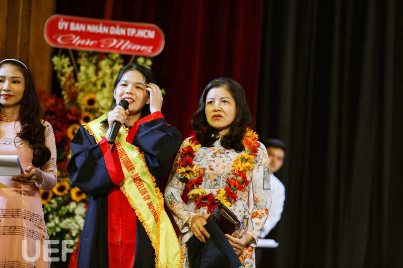 “Con xin cảm ơn ba mẹ, có ba mẹ mới có chúng con ngày hôm nay. Em xin cảm ơn các thầy cô UEF đã luôn đồng hành, dìu dắt chúng em trong khoảng thời gian học tập vừa qua. Kiến thức mà thầy cô đã truyền đạt cho chúng em sẽ mãi là hành trang vững chắc để chúng em tự tin bước đi trên con đường mình đã chọn. Cảm ơn Nhà trường đã tạo môi trường học tập năng động, bổ ích giúp chúng em hoàn thiện bản thân và trở thành một phiên bản tốt hơn của chính mình". Những lời chia sẻ chân thành từ tân Thủ khoa ngành Ngôn ngữ Nhật – Nguyễn Lê Bảo Ngân đã khiến cho cả khán phòng Nhà hát Hòa Bình vỡ òa cảm xúc trong buổi lễ tốt nghiệp diễn ra vào sáng nay (4/4).