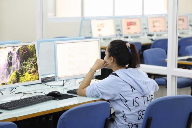 Thí sinh làm bài test tiếng Anh tại Trung tâm máy tính trước khi sang phần vấn đáp với giảng viên ngoại ngữ