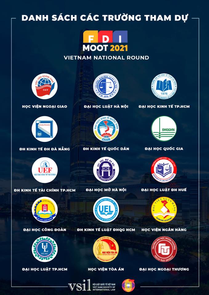 Vòng thi quốc gia FDI Moot 2021 do Hội Luật quốc tế Việt Nam (VSIL) phối hợp với Học viện Ngoại giao (DAV) tổ chức đã thu hút tổng cộng 18 đội thi đến từ 15 trường đại học trên cả nước. UEF là một trong 2 trường đại học ở miền Nam vượt qua vòng loại.