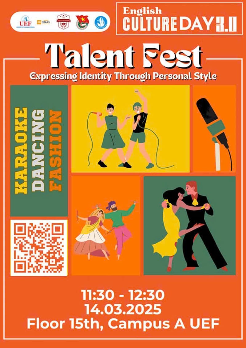 Tham dự English Culture Day 3.0 với chủ đề "Diversity in the English-Speaking World" diễn ra vào ngày 14/3, UEFers sẽ được hòa mình vào không gian văn hóa đa sắc màu với hàng loạt hoạt động hấp dẫn, từ gian hàng triển lãm, cuộc thi trang trí "Cultural Showcase Booths", triển lãm "Crafting English Heritage" đến seminar "Voices of English-Speaking Nations", cuộc thi Talent Fest hay cuộc thi Rung chuông vàng. Cụ thể: