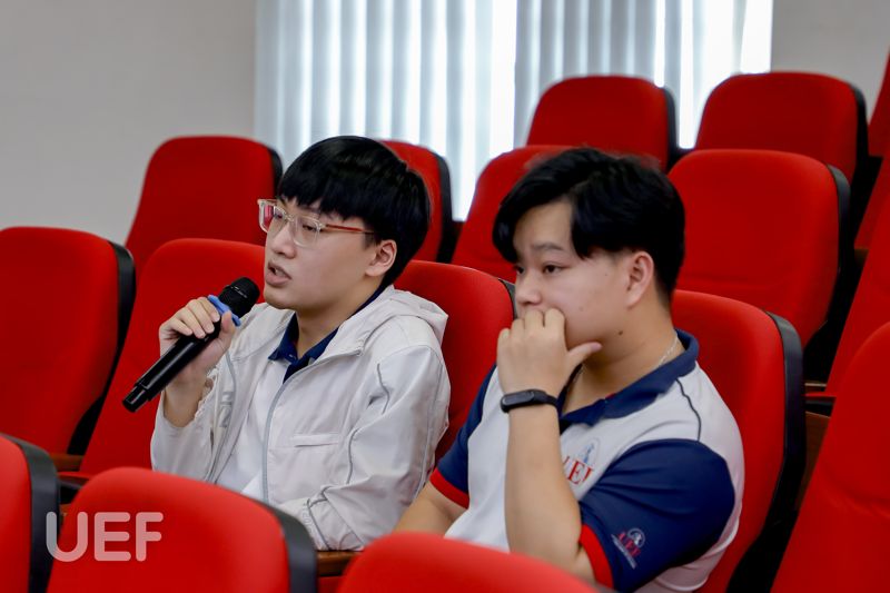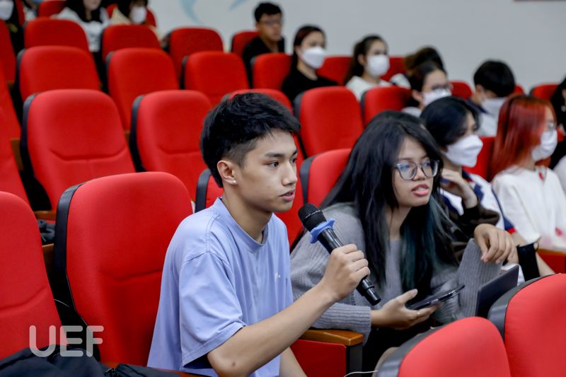 Thầy Quang Tám đã giúp sinh viên ôn lại những kiến thức cơ bản nhất về các loại câu trong tiếng Anh như câu đơn, câu ghép, câu phức,... và cấu trúc của từng loại. Để làm rõ sự khác biệt về mặt thành phần và cấu trúc câu của Anh ngữ so với Việt ngữ, thầy đưa ra những ví dụ đơn giản, gần gũi giúp UEFers dễ hiểu và nắm vững kiến thức hơn. Với cách truyền tải của thầy, sinh viên phải tương tác trực tiếp để tiếp nhận kiến thức. Đó cũng là cách để rèn luyện kỹ năng sử dụng ngoại ngữ của các bạn.