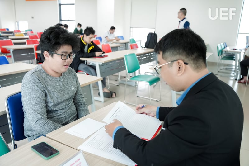 Tại vòng loại, các thí sinh được phổ biến quy tắc cuộc thi một cách rõ ràng. Các bạn lần lượt tham gia bài kiểm tra từ vựng với đa dạng chủ đề, từ cơ bản đến nâng cao, giúp kiểm tra toàn diện kiến thức ngôn ngữ của mình. Sau phần kiểm tra, UEFers tiếp tục tham gia phỏng vấn nhanh 1:1 với ThS. Nguyễn Đình Tuấn cùng ThS. Lê Hoàng Nhi An.