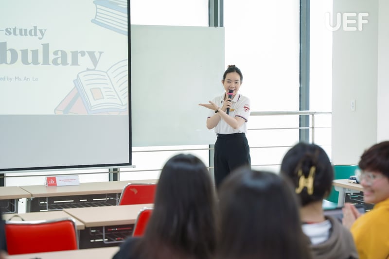 Tiếp đó, ThS. Lê Hoàng Nhi An - Giảng viên Khoa Tiếng Anh đã mang đến những kiến thức bổ sung hữu ích về từ vựng. Cô khuyến khích sinh viên học từ vựng thông qua cụm từ và ngữ cảnh, thay vì chỉ học từ đơn lẻ. Phương pháp này vừa giúp ghi nhớ các từ vựng lâu hơn vừa cải thiện khả năng sử dụng từ ngữ linh hoạt trong giao tiếp hàng ngày. Ngoài ra, cô Nhi An cũng hướng dẫn sinh viên học từ đồng nghĩa và trái nghĩa để mở rộng vốn từ cũng như cách phân loại từ theo nhóm chủ đề để dễ dàng tiếp thu.