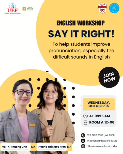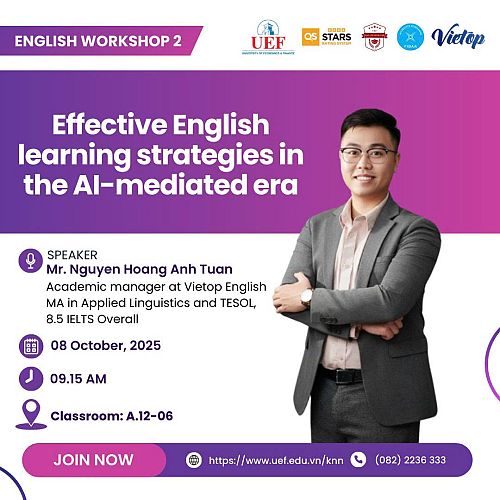 Tiếp nối chuỗi English Workshop do Khoa Tiếng Anh tổ chức, sáng ngày 8/10, sinh viên đã được tìm hiểu cách học tiếng Anh hiệu quả bằng công nghệ AI qua góc nhìn thực...