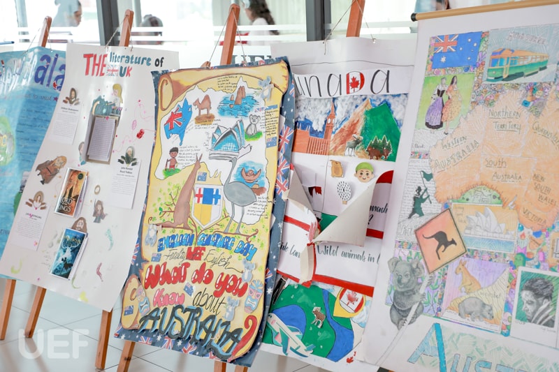 Tại hoạt động triển lãm poster - Coloring the Anglosphere, sinh viên đã chiêm ngưỡng các tác phẩm tranh, ảnh giới thiệu các quốc gia Anh, New Zealand, Canada, Australia,... Sản phẩm được UEFers trang trí thủ công bằng hình thức cắt dán với nhiều tone màu, trang trí đa dạng.