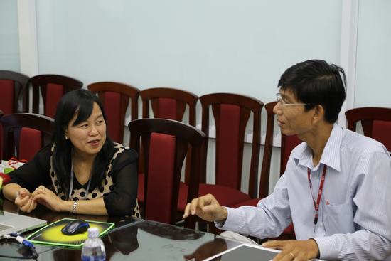 Thầy Trần Minh Cảnh, giảng viên Khoa Ngoại Ngữ trao đổi với cô Thanh Hoa về bài thi Aptis