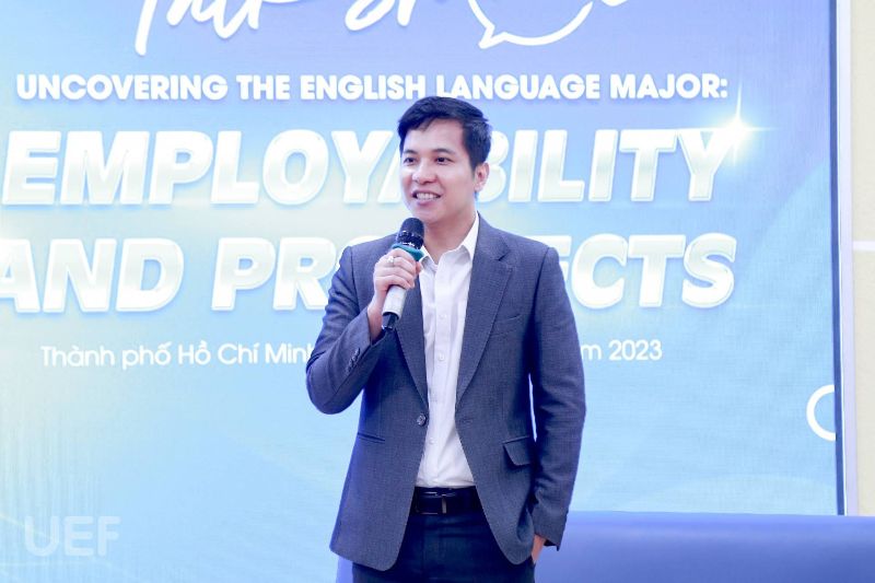Mở đầu buổi chia sẻ, TS. Phạm Huy Cường - Trưởng khoa Tiếng Anh gửi lời cảm ơn đến các khách mời đã đến và chia sẻ những kinh nghiệm trong nghề cho các bạn sinh viên UEF nói chung và sinh viên ngành Ngôn ngữ Anh nói riêng. Đối với sinh viên ngành Ngôn ngữ Anh, sau khi học kiến thức nền tảng trong vòng 2 năm đầu, các bạn cần lựa chọn một trong 4 chuyên ngành sau: Tiếng Anh thương mại; Tiếng Anh truyền thông; Biên - Phiên dịch tiếng Anh; Lý luận và giảng dạy bằng tiếng Anh. Thầy Phạm Huy Cường cũng hy vọng sau khi tham dự buổi talkshow, các bạn sinh viên nên cân nhắc thật kỹ cho việc lựa chọn chuyên ngành phù hợp.