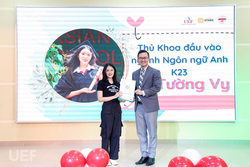Khoa cũng tuyên dương, khen thưởng đối với các bạn sinh viên có tinh thần tham gia tích cực vào các hoạt động sinh viên, phong trào Đoàn - Hội trong năm học 2022-2023, đội ngũ tham gia trợ giảng,.. Đồng thời, tân sinh viên Hồ Tường Vy được ghi nhận và trao thưởng với thành tích Thủ Khoa đầu vào ngành Ngôn ngữ Anh khoá 2023.