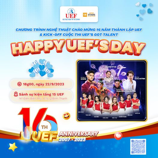 Không khí chưa thể hạ nhiệt, tối 22/9, Phòng Công tác sinh viên và Viện Văn hóa - Nghệ thuật UEF sẽ tiếp tục mở ra “bữa tiệc âm nhạc” ấn tượng. Đó là chương trình nghệ thuật kết hợp kick-off cuộc thi "UEF's Got Talent" chủ đề Happy UEF’s Day. Đêm nhạc có sự góp mặt của nghệ sĩ khách mời ca sĩ Hoàng Mỹ An, ca - nhạc sĩ Chen, biên đạo Fung Huỳnh, đương kim vô địch Đông Nam Á Phan Hiển - Thu Hương và các câu lạc bộ nghệ thuật UEF,...
