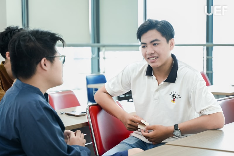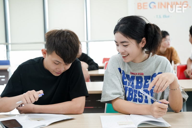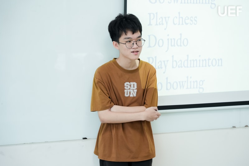 Các buổi học được thiết kế với trọng tâm là khơi gợi sự chủ động và khả năng tư duy bằng tiếng Anh thông qua các hoạt động tương tác liên tục. Từ việc nhận "key words" do giảng viên cung cấp, học sinh không chỉ ghi nhớ từ vựng một cách máy móc mà còn tham gia đặt câu hỏi, khai thác thông tin từ bạn bè, sau đó trình bày lại với giảng viên. Quá trình này đòi hỏi các bạn phải lắng nghe, tư duy phản biện và phối hợp trong giao tiếp. Đây đều là những kỹ năng rất cần thiết trong môi trường học thuật song ngữ tại UEF và chính là hành trang vững chãi cho nghề nghiệp sau này.