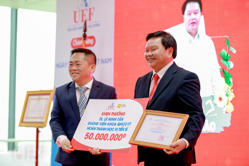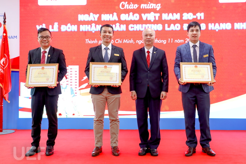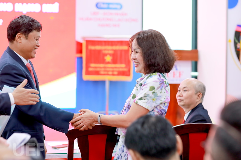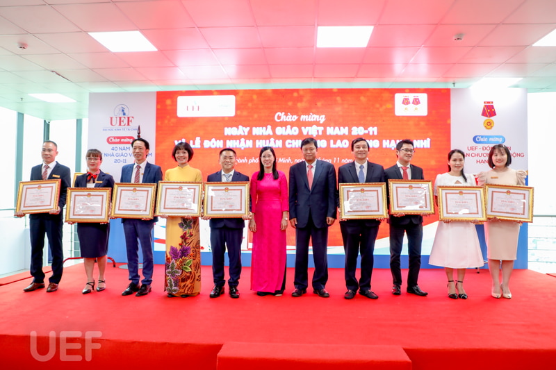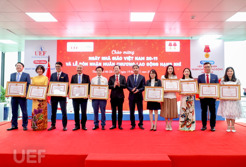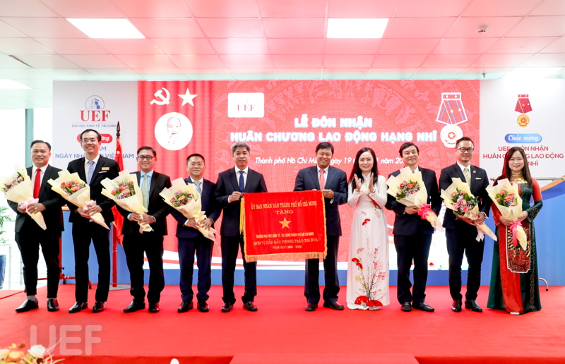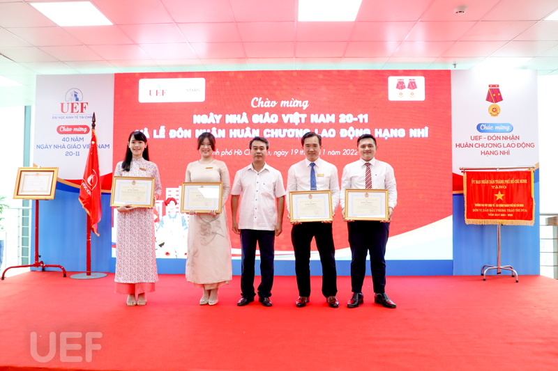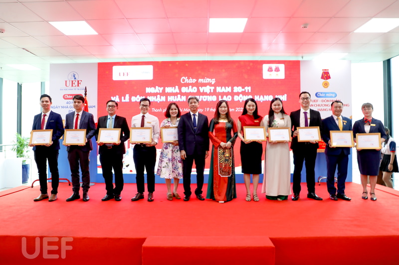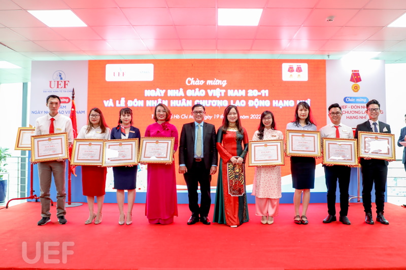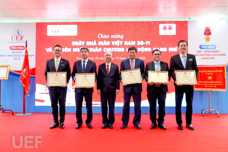 Với những kết quả đáng tự hào đó, tại buổi lễ, UEF đã vinh dự đón nhận Huân chương Lao đông hạng Nhì được Chủ tịch nước ký quyết định trao tặng. Đây là phần thưởng cao quý của Nhà nước tặng cho cho tập thể có thành tích xuất sắc trong công tác nghiên cứu khoa học và đào tạo nguồn nhân lực chất lượng cao, góp phần vào sự nghiệp xây dựng chủ nghĩa xã hội và bảo vệ Tổ quốc. Đồng thời, UBND TP.HCM đã quyết định tặng Cờ thi đua cho tập thể Nhà trường vì đã có thành tích hoàn thành xuất sắc nhiệm vụ năm học 2021 - 2022, dẫn đầu khối thi đua thuộc Thành phố, góp phần tích cực trong phong trào thi đua của Thành phố.