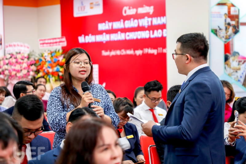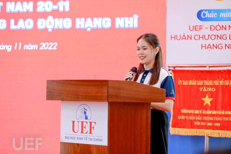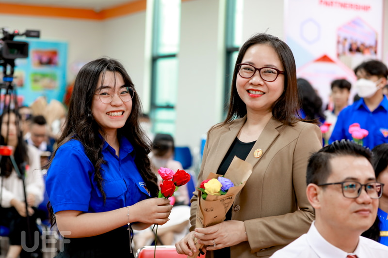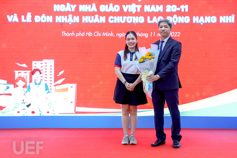 Đại diện tập thể sinh viên UEF, bạn Đặng Bảo Trân – Phó Chủ tịch Hội Sinh viên Việt Nam trường UEF đã gửi những tình cảm yêu thương đến thầy cô: “Nếu ví công ơn sinh thành và dưỡng dục của cha mẹ như núi cao trời rộng thì công ơn dạy dỗ của thầy cô tựa như biển khơi bao la. Nhân ngày Nhà giáo Việt Nam hôm nay, em cũng như các bạn sinh viên UEF một lòng hướng về thầy cô để bày tỏ lòng biết ơn sâu sắc. Các thầy cô, mỗi người đều là một mảnh ghép trong bức tranh tổng thể, xây nên một mái nhà ấm áp cho sinh viên UEF. Nhân ngày 20/11, em kính chúc quý thầy cô thật nhiều sức khỏe, luôn giữ được ngon lửa đam mê với sự nghiệp trồng người để tiếp tục công việc của những ngươi lái đò thầm lặng, đưa “những đứa con” thân yêu đến bến bờ tri thức”.